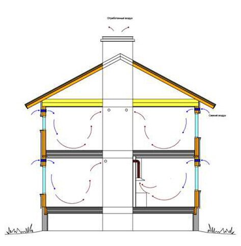 - Естественная – простота и дешевизна. Вполне возможно сделать такую вентиляцию самостоятельно, без чьей-либо помощи. Она зависит от нескольких факторов – от разности внутренней температуры воздуха и наружной, от разности показателей давления между притоком и оттоком воздуха, от направления ветра. Минусом такого варианта является его зависимость от переменных обстоятельств.
